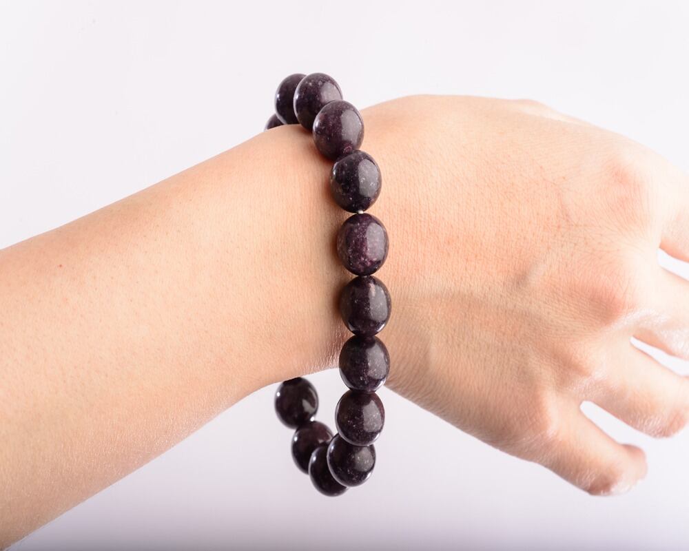 紫と赤とピンクを混ぜたような、はっきり「○○色」と断定しにくい色あいのせいか、レピドライトには「地味」という印象を持たれている方も多いようですが、シックで落ち着いたカラーは肌馴染みが良く、雲母結晶がキラキラッと輝いて、何ともいえない奥深い魅力があります。また、ピンクや紫、赤、黒色など、主張の強い色あいの石と組み合わせても、驚くほどすんなり溶け込む不思議なところがあり、男女を 問わず人気のあるパワーストーンです。