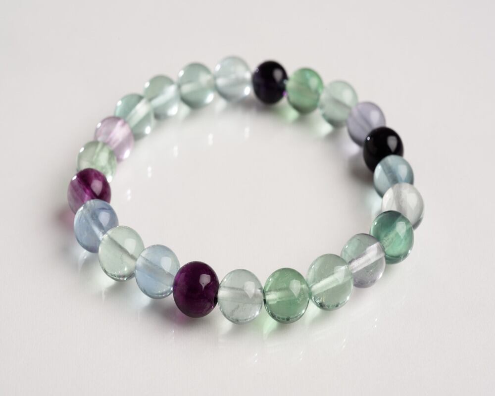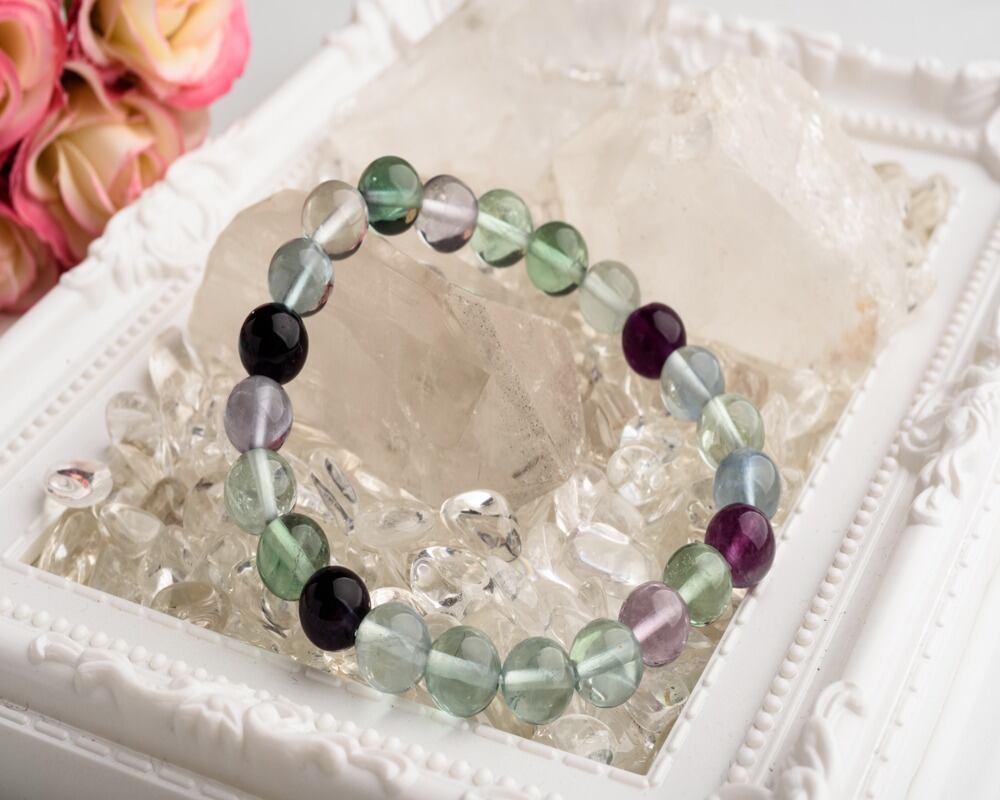 フローライトは色別にエネルギー的特性が多少異なります。あくまでも傾向としてですが、パープル系は明晰性や感受性を高める傾向、グリーン系は癒し的に働き、グラデーションカラーのものは、想像力を高める傾向が強いようです。